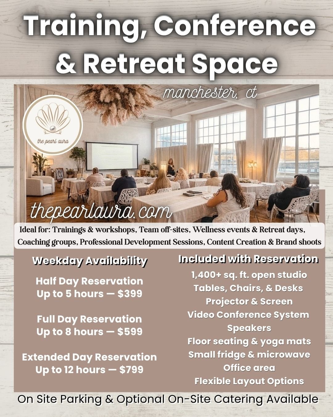 To reserve The Pearl Aura for Content Creation, or to facilitate your own retreat day, training, or workshop, please email: Events@thepearlaura.com